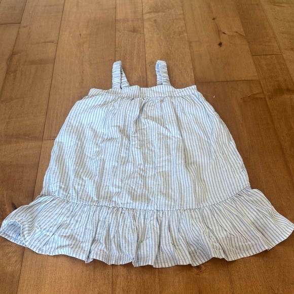 Cute lightweight sundress with thin blue and white stripes. Features thin shoulder straps and a ruffled hem. Soft, breezy fabric perfect for warm days.