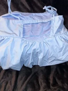 Light blue two-piece women's set with a ruffled peplum top and matching skirt. Soft, breathable fabric for comfortable all-day wear. Adjustable straps and elastic waist for a customizable fit. Stylish light blue color pairs easily with accessories.