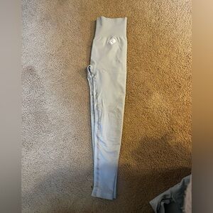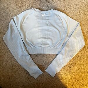 Soft light blue active leggings and matching long sleeve top. Stretch fabric for comfortable movement. High-rise waistband and breathable knit panels for all-day wear. Light blue color adds a calm, versatile look.