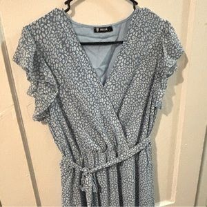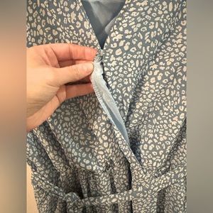 Good Condition, very gently loved. Light blue, white leopard pattern. Wrap Dress. Clasp to help close along neck line. Neckline makes a low (not deep) V cut. Backs is high scoop neckline around base of neck. Loose flutter sleeves cover shoulders. Dress hits about T length.