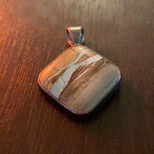 Beautiful 925 sterling silver brooch/pendant featuring a large one inch smooth square stone of a gorgeous light blue and brown pattern! Can be attached to a necklace and worn as necklace or as independent brooch/pendant by attaching to pin!