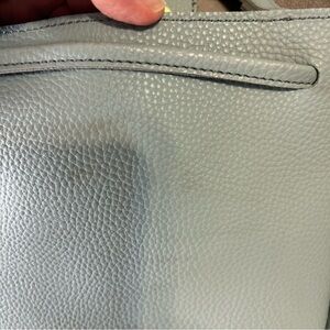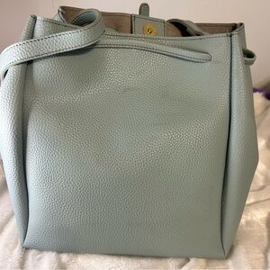 Elegant and stylish light blue faux leather bag perfect for any occasion. Features a sleek design with a secure closure. Ideal for adding a touch of sophistication to your outfit. Has a few marks on the back probably would come off with a cleaning.