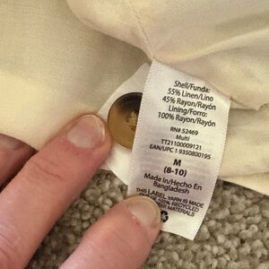 Linen blend material, fully lined top and all the way down to between the last 2 buttons, pockets and side kick slits. Stretch waistband for perfect fit!