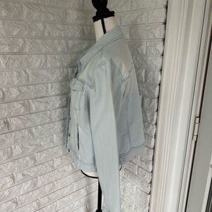 Stylish light blue denim jacket perfect for any casual outing. Features a classic button-up front and two chest pockets for added style.