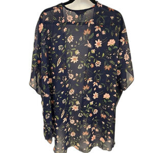 This light and breezy navy blue & floral jacket would be hip length on most. It’s a size small but would fit size small to large.