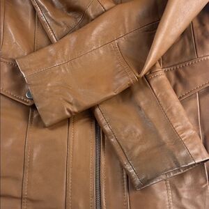 This is a great light brown Christian Reed leather aviator jacket! Pit to pit is 18 inches and shoulder to bottom hem is 27 inches. The collar can be worn folded down or zipped all the way up. It is missing the belt and there is some slight wear and discoloration, please see pictures.