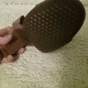 Light brown. Thick low heel. Sandal look. VERY COMFORTABLE! Tried on and never wore out of the house!