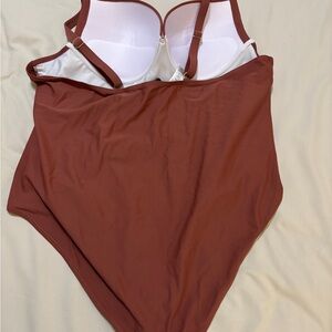 Elegant one-piece with subtle ruching. Features a soft brown hue.