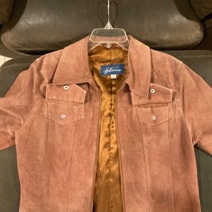 Light brown suede jacket with zippered closure and 2 pockets on upper chest