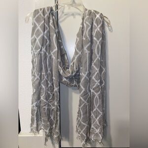 Soft lightweight scarf in a neutral gray with white geometric pattern. Flowy fabric with subtle texture and frayed ends. Versatile accessory for layering.