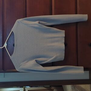 Stylish light gray ribbed cardigan with button closure. Perfect for layering.