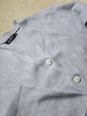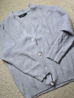 Light gray ribbed cardigan with a V-neck and front buttons. Comfortable knit that layers easily for everyday wear. Classic silhouette in a soft gray shade for versatile styling.