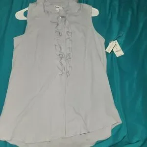Chic sleeveless blouse with ruffle detail. Light gray color adds elegance.