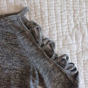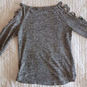 Light gray long sleeve sweater with open cross sleeves and lose shoulder. Great for neutral and effortlessly cozy looks. Purchased from consignment.