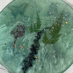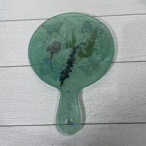 Handcrafted green butterfly and floral resin charcuterie board serving board. Green with glitter and butterfly images and pressed flowers. Please see pics for measurements. Made with food safe, BPA free resin. Due to the nature of the resin process, you might find tiny air bubbles or slight imperfections, these are part of the unique design of each piece.