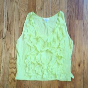 Light green 100% Silk Top. Sleeveless ruffle V neck & a right side 3/4 invisible zipper at seam. CACHE Size 6. Barely been worn. Pet free smoke free home.