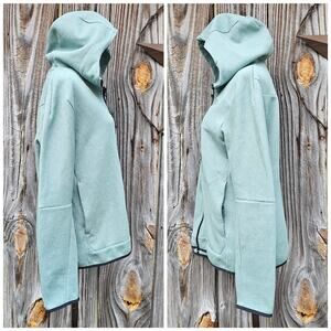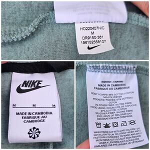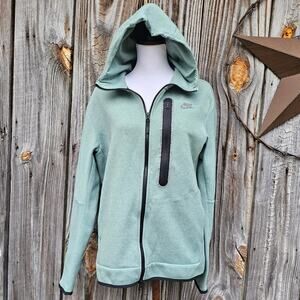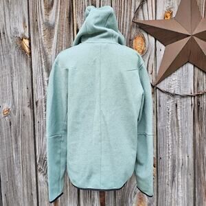 Light green w/ subtle dark heathering, and silver/gray reflective details. Full zip front w/ 2 way zipper, 2 side pockets, 1 large zippered chest pocket, scuba style hood. Minor issue noted in photos. Excellent preowned condition, overall. Size Medium by Nike. Style: DR9150-361