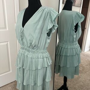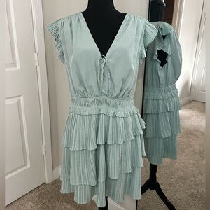 Chic mini dress with layered ruffles. Light green hue. V-neck design. Ideal for casual outings.