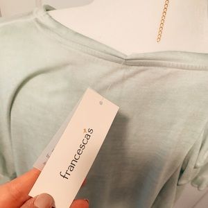 Beautiful, springy ruffled tunic from Francescas. It is from the brand ‘Anglia’. It has ruffles on the sleeves, on the hem & it splits in the back with a ruffle. The tags are still on this top & it has never been worn.