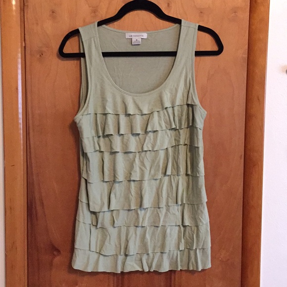 Slimming light green ruffled tank. This would make the perfect shell for under a blazer or dress it down with jeans and flats! No signs of wear! Love this top! Please let me know if you have any questions! ❤️