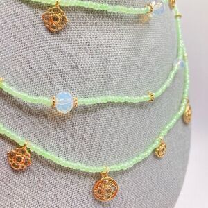 Women’s female multi strand layered Three Strand Light Green Seed Bead and Gold tone Charm Necklace and gold tone Charm Earring Set, The necklace is approximately 18” in length with a 3” extension. The hook earrings have a dainty flower charm, New.