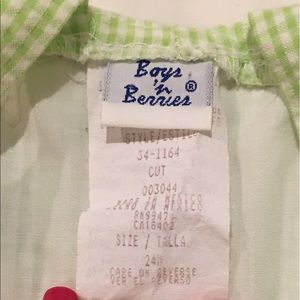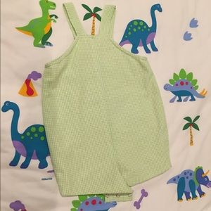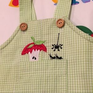 This boutique bought light green seersucker Jon Jon features a single front pocket with whimsical apple, spider, and ant design. Snap crotch and wooden button at chest. Fully lined, no visible defects. 24mo.