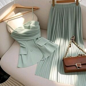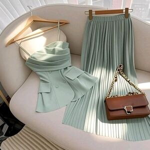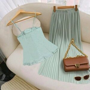 Light Green Women's Strap Tank Top & Elastic Waist Pleated Midi Skirt Set