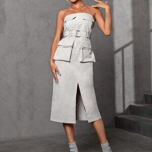 Light Grey Casual Womens Flap Pocket Split Thigh Belted Tube Dress