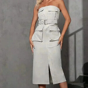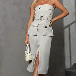 Light Grey Casual Womens Flap Pocket Split Thigh Belted Tube Dress