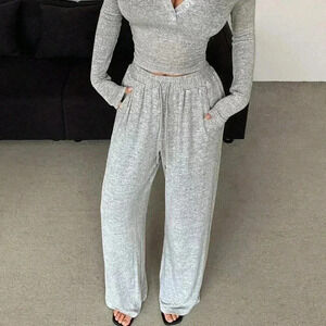 Light Grey Casual Women's Solid Color Button Long Sleeve T-Shirt And Pants Set