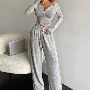 Light Grey Casual Women's Solid Color Button Long Sleeve T-Shirt And Pants Set