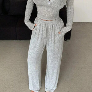 Light Grey Casual Women's Solid Color Button Long Sleeve T-Shirt And Pants Set