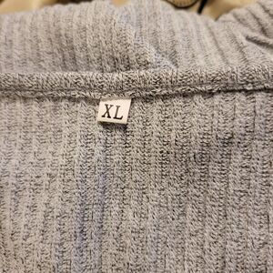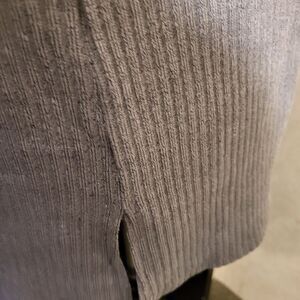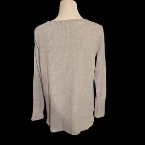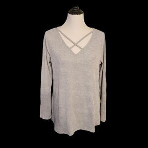 Light Weight Sweater with Criss-Cross Design at Bust. Ribbed Knit material - slits on sides provide a roomy fit. long sleeves. New without tags