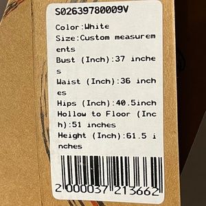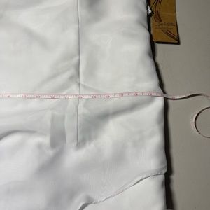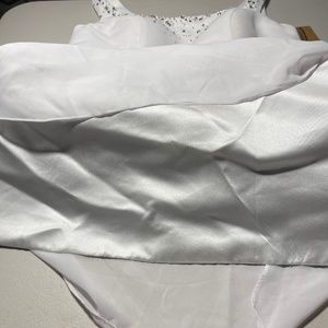 Beautiful white dress with sequence and rhinestones around the neckline front and back. Skirt has multiple layers. Fully lined. Zipper in the back. Could be worn for many occasions, formal, dances, banquets. New with tags. No stains, tears, or blemishes.