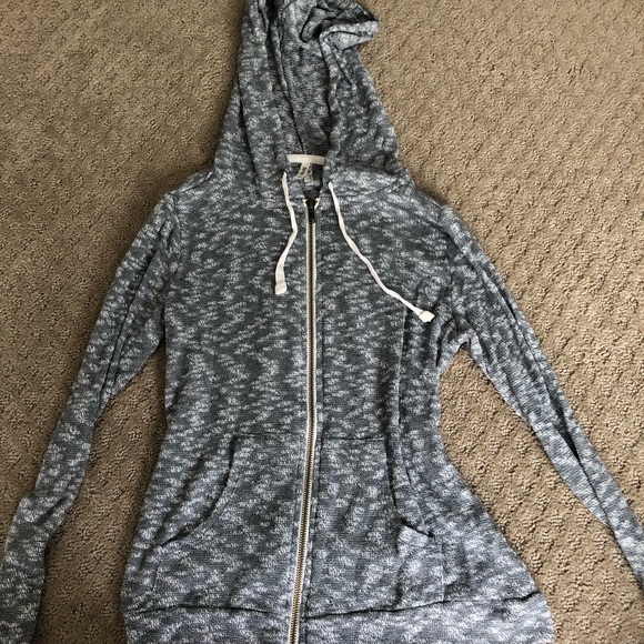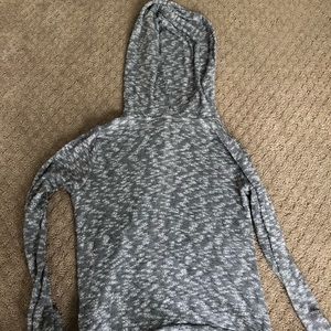 Gray and white speckled jacket, very light, has hood, pockets and full zipper