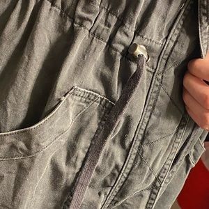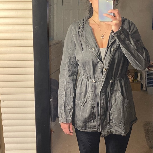 very light jacket. gray. baarelt worn, but super cute! zips, and buttons. (adjustable) sinched waist, two pockets on front