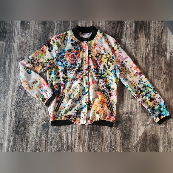 Colorful bomber jacket. Add a pop of color to your outfit. It has a zipper closure. Fits like a small.