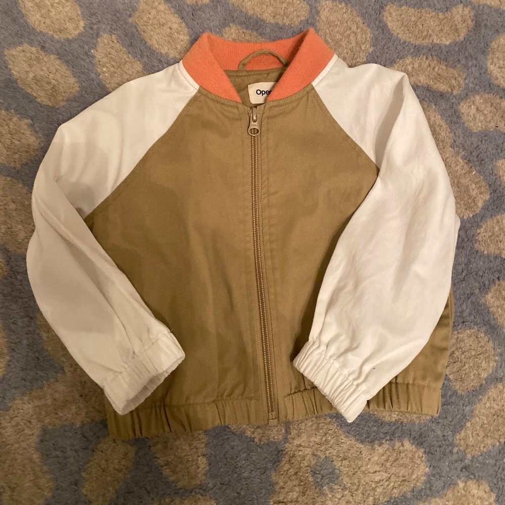 Tan and white cotton bomber jacket with orange trim and graphic on back