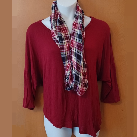 Lightweight dolman sleeve knit top with asymmetrical hem and matching infinity scarf. Top: 97% rayon, 2% polyester, 1% spandex. Machine wash, dry flat. Scarf: 100% viscose. Hand wash, line dry.