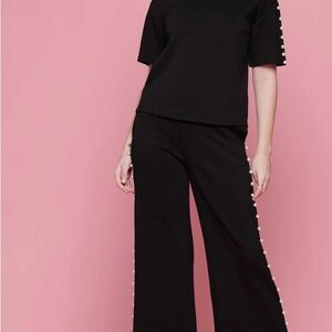 Pearl detail set, elegant black two-piece, wide leg pants outfit, matching top and pants, chic evening wear, sophisticated pearl trim, minimalist style, timeless wardrobe staple, classy black set, lined lyocell outfit