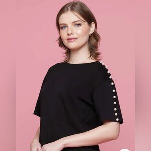 Elevate your wardrobe with this chic two-piece set featuring elegant pearl detailing along the sides. The wide-leg pants and short-sleeve top are both crafted from lightweight lyocell and lined for added comfort. Perfect for a sophisticated evening out, a special occasion, or polished everyday wear.