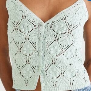 Embrace a fresh, bohemian vibe with this light mint crochet crop top. Featuring delicate crochet patterns and a flattering V-neckline, this top offers a casual yet stylish look perfect for warm weather. The button-up front adds a vintage touch, while the adjustable straps provide comfort. Pair it with high-waisted jeans or shorts for an effortless, laid-back summer style. Ideal for beach outings or casual day trips.