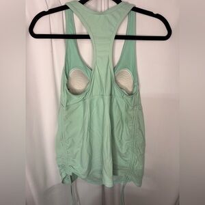 Soft mint racerback tank top. Built-in bra and V-neck front. Drawstring hem detail.