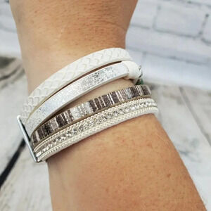 This is a beautiful multi strand faux leather bracelet with sparkle, beading, texture, and unique character. Measure 8in. Bands are all connected and has a magnetic closure.