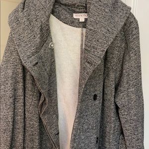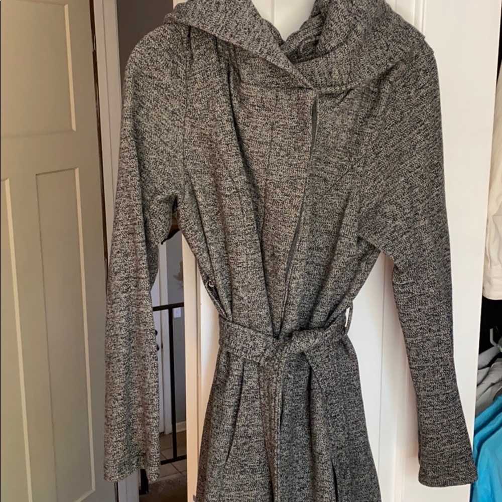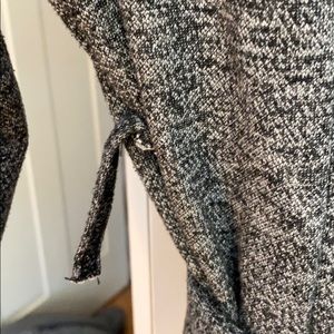 Heather gray. Adjustable belt (tie). The belt loop on one side needs to be stiched back on (belt still stays in place when tied)