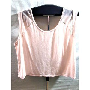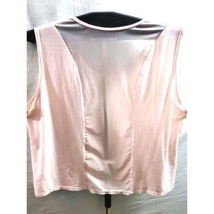 This top is in great condition and is a soft light peach color. It has no tags, but it is a size 2X. The shoulders have a cute mesh detail and cap sleeves, and the center back is sheer mesh cut out. It is also a crop top.