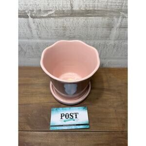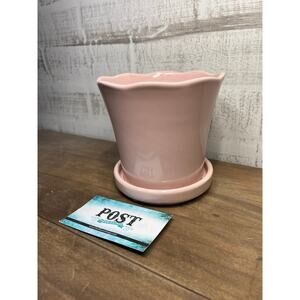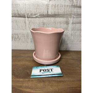 Light pink color, ripped edge pot, with a plug and a tray to keep your plants happy, it is made of ceramic, it is 5” tall, 5” diameter