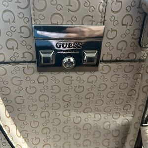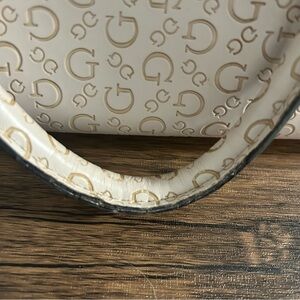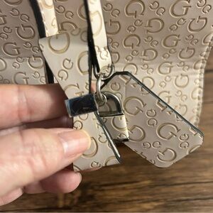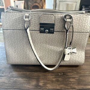 Pre-loved Pink Guess handbag, with Bow tie tag on the handle, chrome hardware.