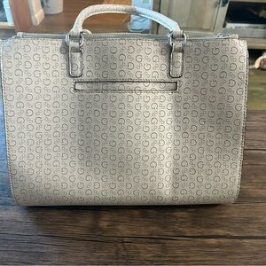 Bag has a little bit of spilled wax on the inside, most likely will come out *see pics. A spot on the very bottom of the bag and a little trim on the handle has come off, it’s not noticeable. Please refer to all of the photos. Bag is still in great condition. It has tons of storage on the inside, also has 2 zipper pockets on each side.