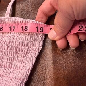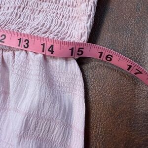 Light Pink, Ruched Bodice, Baby Doll Mini Dress, Adjustable Spaghetti Straps, Ruffled Layered Swing Skirt, Size L, Pit to Pit = 16" (19" stretched), Waist side to side = 15" (18" stretched), Shoulder to Hem = 33" (Adjustable straps) Great Condition!